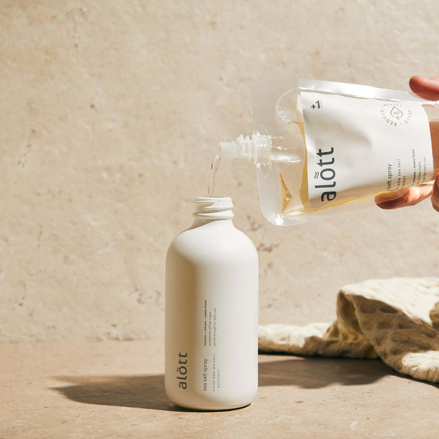 - our alott sea salt spray comes in a glass bottle that can be refilled and reused, before being recycled.